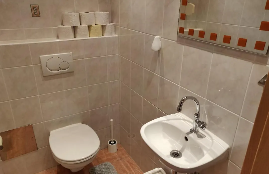 Im Badezimmer des Apartments Relax - Ferienhaus in Wien stehen den Gästen ein Haartrockner und ein Wäschetrockner zur Verfügung. Außerdem findet man hier eine Dusche.